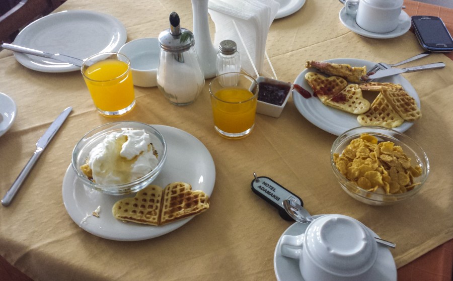 La colazione in albergo è di tipo internazionale: molto spazio per il salato e poco per il dolce. Non ci sono croissant sulla lunga tavola apparecchiata per i clienti ma pane di segale oppure panini particolari con semi salutari per i più attenti, salumi vari, marmellate, burro e formaggi spalmabili, cetrioli e pomodori, uova sode, yogurt e